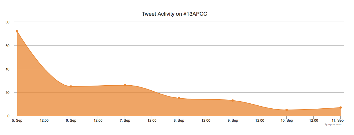 The conference hashtag (#13APCC) was registered with Symplur, which allowed analytics to be obtained (see above figure). Close to 600 participants sent almost 5,000 tweets during the conference period, which generated over six million impressions, each of which represents an opportunity for an individual to come into contact with a tweet containing the conference hashtag.