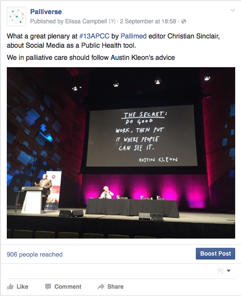 With a theme of ‘Fit for the Future’, the 13th Australian Palliative Care Conference utilised a coordinated and multifaceted social media strategy to enhance the delegates’ experience and reach new audiences globally. This was achieved through the concerted efforts of team Palliverse (@Palliverse) and other key individuals, including Christian Sinclair (@ctsinclair).